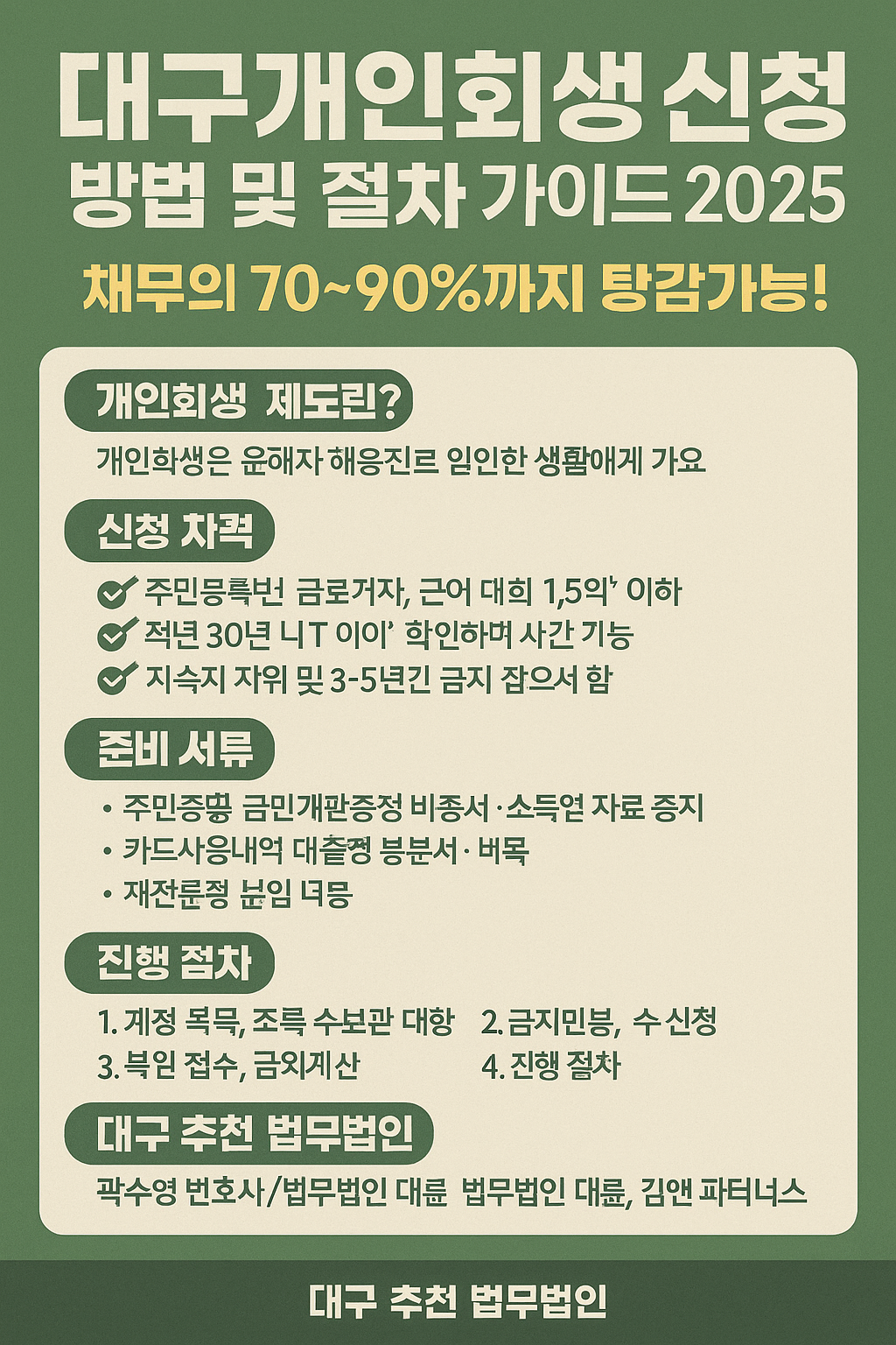 📌 곽수영 변호사 (법무법인 이오) – 대구 중심 개인회생 전문 변호사로 자영업자·급여소득자 사건 다수 – 실제 변제율 10~30% 성공 사례 다수 보유 📌 법무법인 대륜 대구사무소 – 수성구 동대구로 위치, 전국 네트워크 기반 – 무료 전화상담 가능, 신속 대응 📌 김앤파트너스 도산센터 – 회생·파산 전문센터 운영, 1:1 맞춤 컨설팅