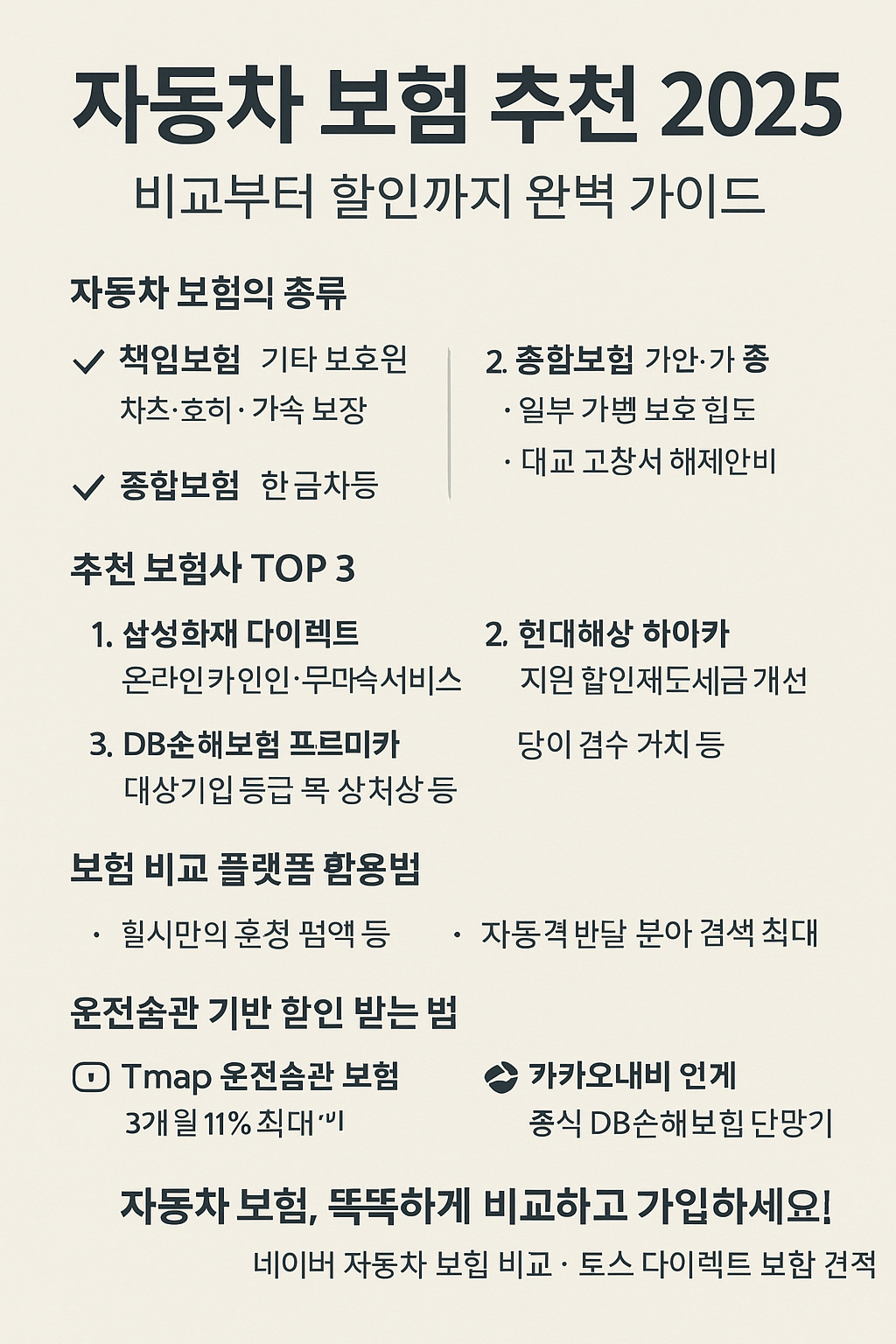 #자동차보험 #자동차보험추천 #다이렉트보험 #삼성화재 #현대해상 #DB손해보험 #자동차보험비교 #운전습관할인 #마일리지특약 #자차보장 #보험비교사이트 #네이버보험 #토스보험 #운전자보험 #차량보험 #보험갱신 #보험특약 #보험할인팁 #2025보험 #보험정보