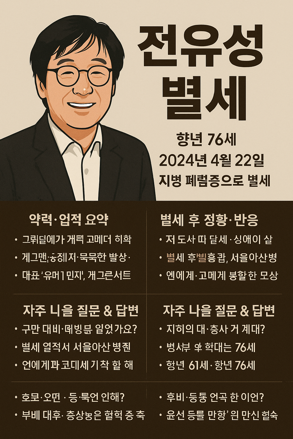 전유성 선생님은 한국 코미디의 역사를 쓰신 거장이자, 수많은 후배와 대중에게 웃음을 선사한 따뜻한 분이었습니다. 그의 별세는 큰 슬픔이지만, 남긴 발자취와 유산은 우리 곁에 오래 남아 계속해서 웃음을 전할 것입니다.
