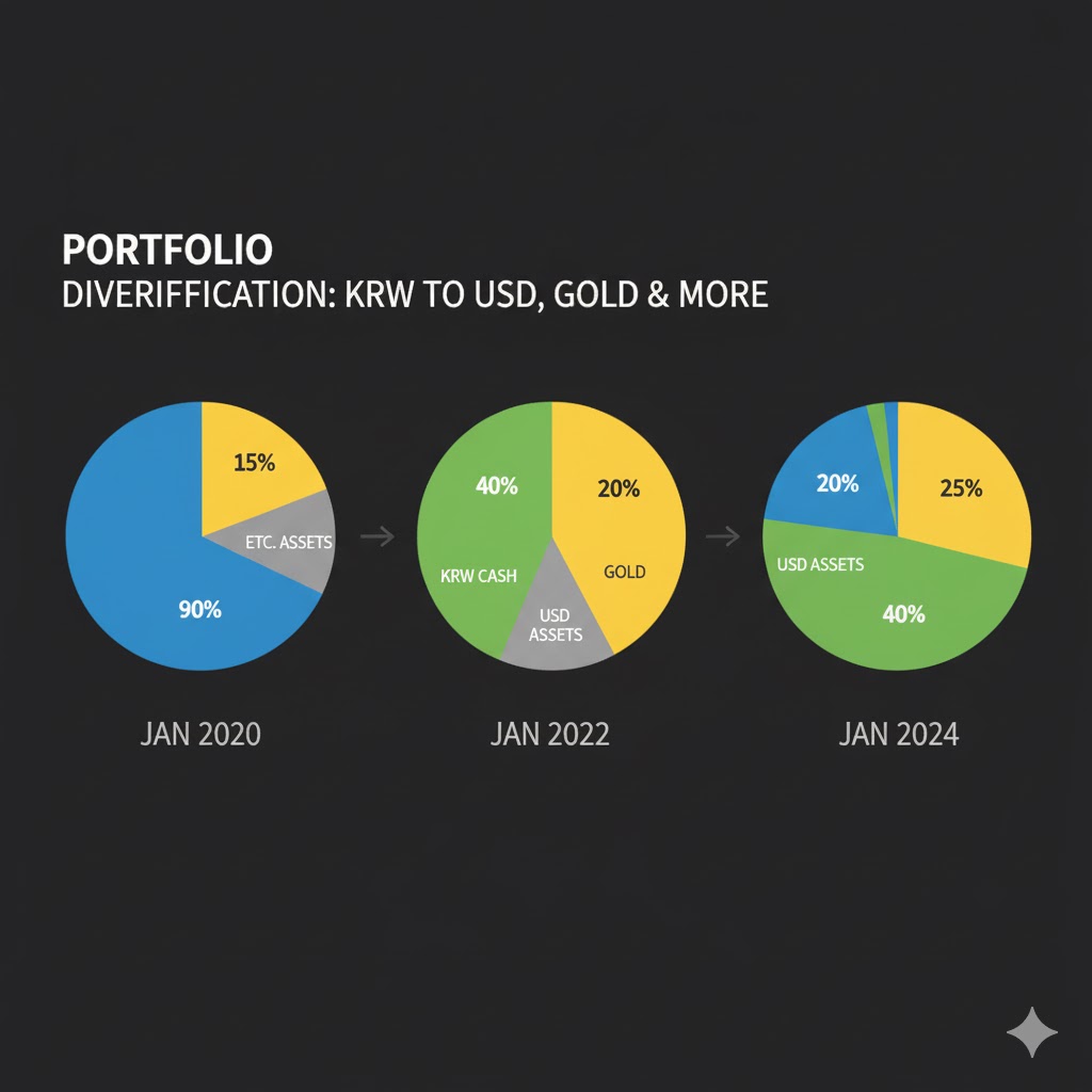 가장 시급한 점검 사항입니다. 만약 당신의 자산이 100% 대한민국 원화(부동산, 원화 예금, 국내 주식)로만 구성되어 있다면, 당신은 **'원화 가치 하락'**이라는 하나의 위험에 모든 자산을 노출하고 있는 것입니다.