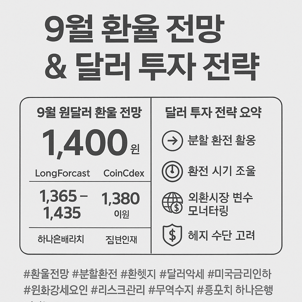 지금까지 2025년 9월 환율 전망과 달러 투자 전략을 정리해보았습니다. 1,400원 근처의 박스권 환율 속에서, 무작정 환전하거나 기다리는 방식보다는 **전략적인 분할 환전**이 중요한 시기입니다.