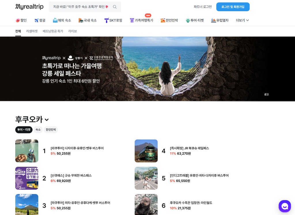 여행 경비의 가장 큰 비중을 차지하는 항공권과 숙소. 마이리얼트립 홈페이지에서는 이 두 가지를 매우 효율적으로 검색하고 예약할 수 있는 강력한 기능을 제공합니다.