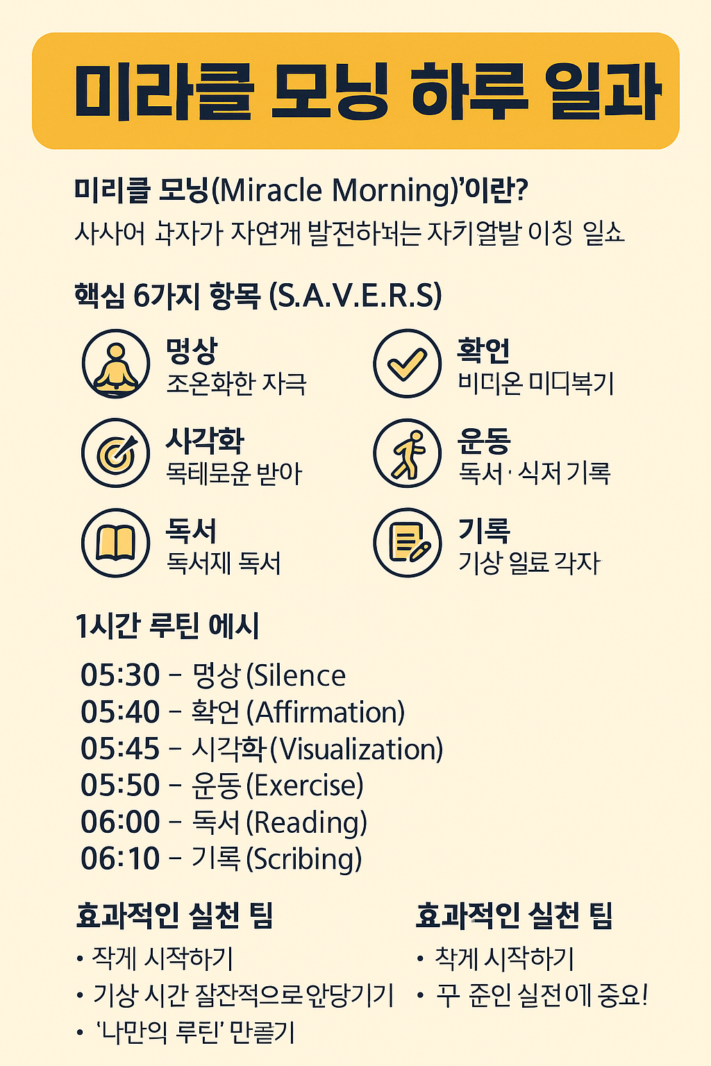 #미라클모닝 #아침루틴 #자기계발루틴 #명상습관 #확언루틴 #시각화훈련 #독서습관 #기록습관 #할엘로드 #미라클모닝루틴 #SAVERS #새벽기상 #성공습관 #루틴만들기 #하루일과추천 #자존감습관 #마인드풀니스 #모닝루틴 #기적의아침 #루티너리