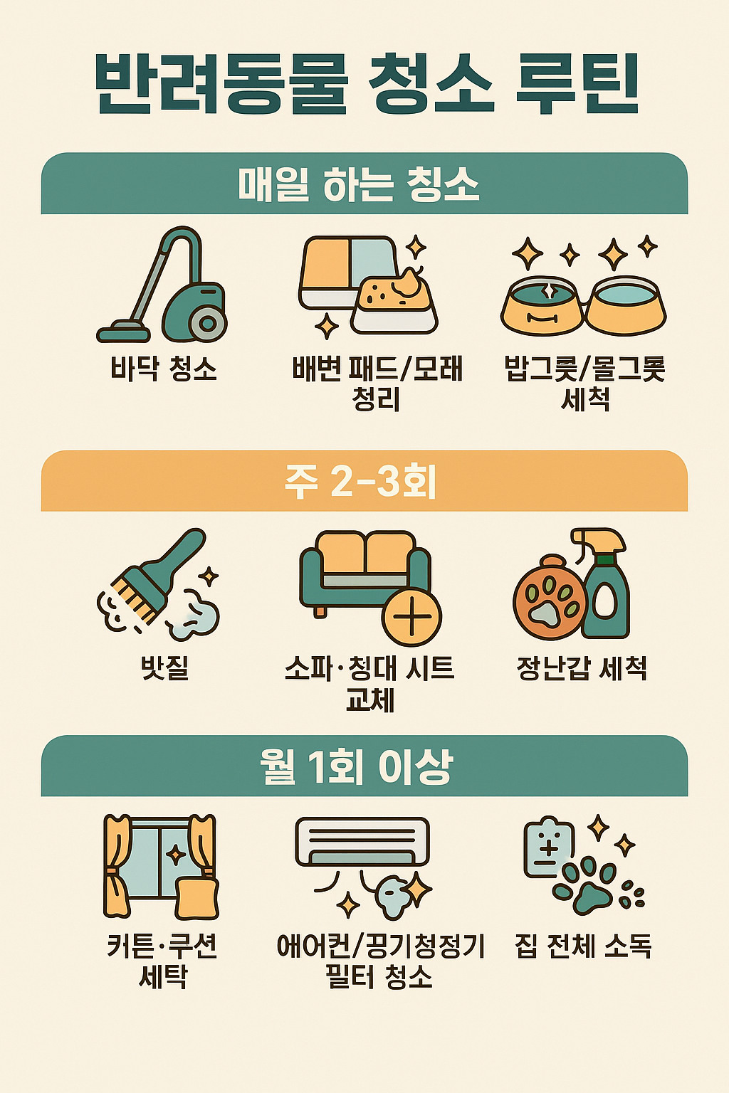 꾸준한 루틴만 지켜도 반려동물과 함께하는 집은 언제나 쾌적할 수 있습니다.