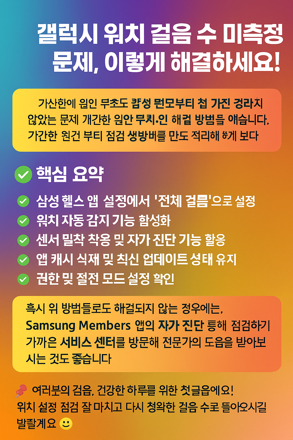 지금까지 갤럭시 워치에서 걸음 수가 측정되지 않는 문제에 대해 가능한 원인부터 점검 방법, 실전 팁까지 모두 정리해보았습니다. 대부분의 경우 앱 설정, 권한, 착용 상태 또는 센서 초기화만으로 간단하게 해결이 가능하다는 점 기억해주세요!