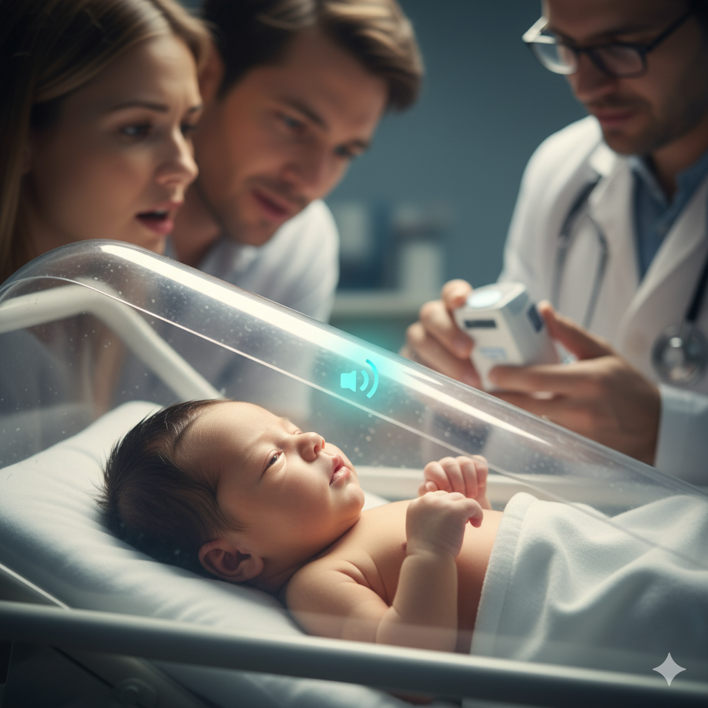 - 선별 검사 (AABR: 자동청성뇌간반응검사): 아기가 잠든 상태에서 작은 소리를 들려주고, 뇌에서 전달되는 반응(뇌파)을 측정하는 방식입니다. 가장 보편적이고 정확도가 높은 검사입니다.