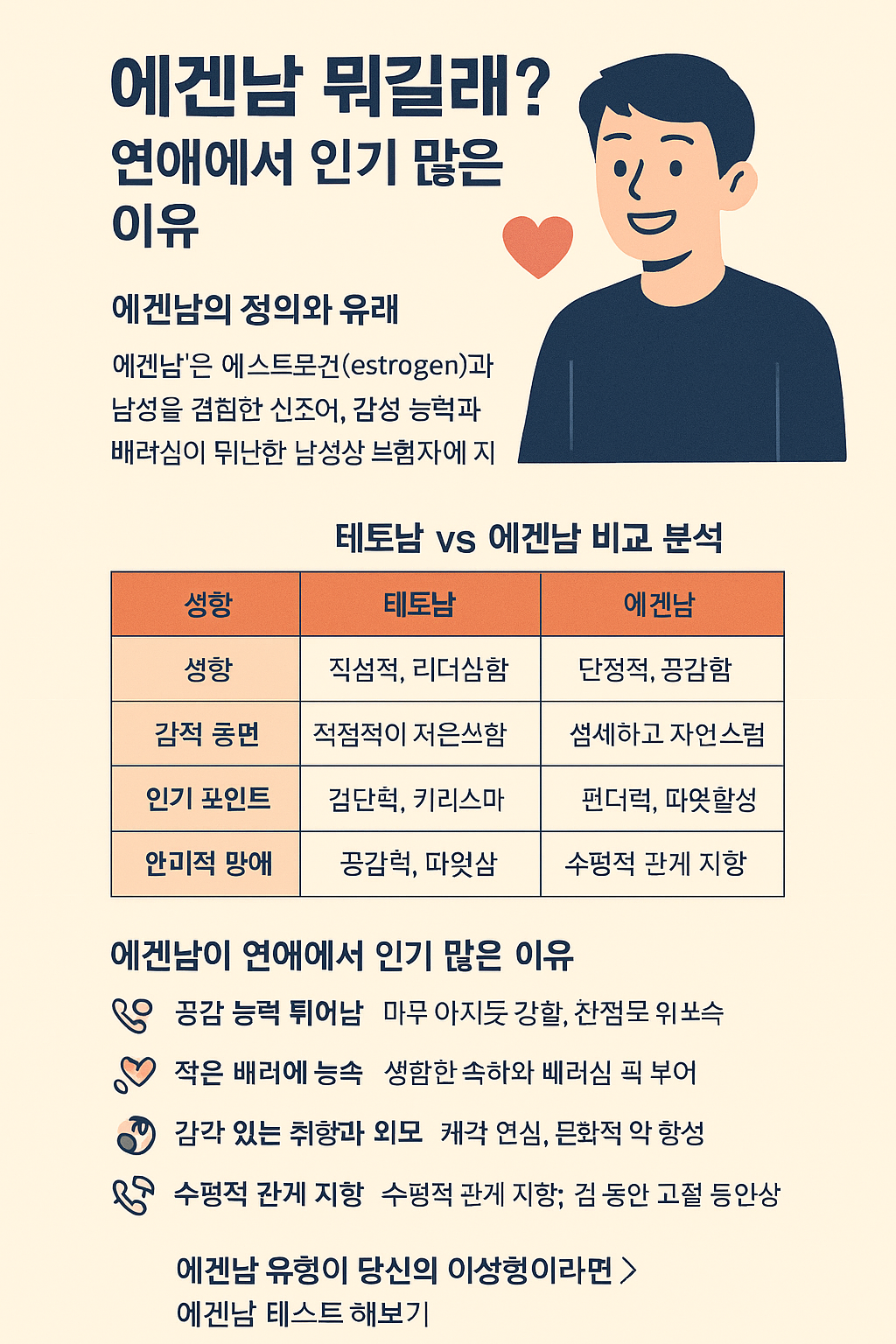 에겐남은 단지 “감성적인 남자”를 넘어서, 감정적 안정감, 공감, 배려을 통해 연애에서 차별화된 매력을 주는 연애 상대 유형입니다. ‘나를 잘 이해해주는 사람’을 찾는 분들이라면, 에겐남 유형의 감성을 참고해보는 것도 좋은 인사이트가 될 수 있어요.