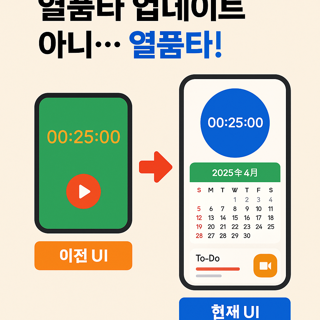 여러분! 이런 적 있으시죠?! 열품타 업데이트 되고 나서 익숙한 홈이 사라지면… “업데이트 아니 열품타!” 하는 심정, 완전 이해됩니다. 오늘은 열품타의 최근 업데이트 내용을 상세히 정리하고, 익숙한 UI가 그리운 분들을 위한 홈화면 복구 꿀팁까지 쏙쏙 담아왔어요. 더 나은 집중력 활용법도 함께 알려드릴게요!