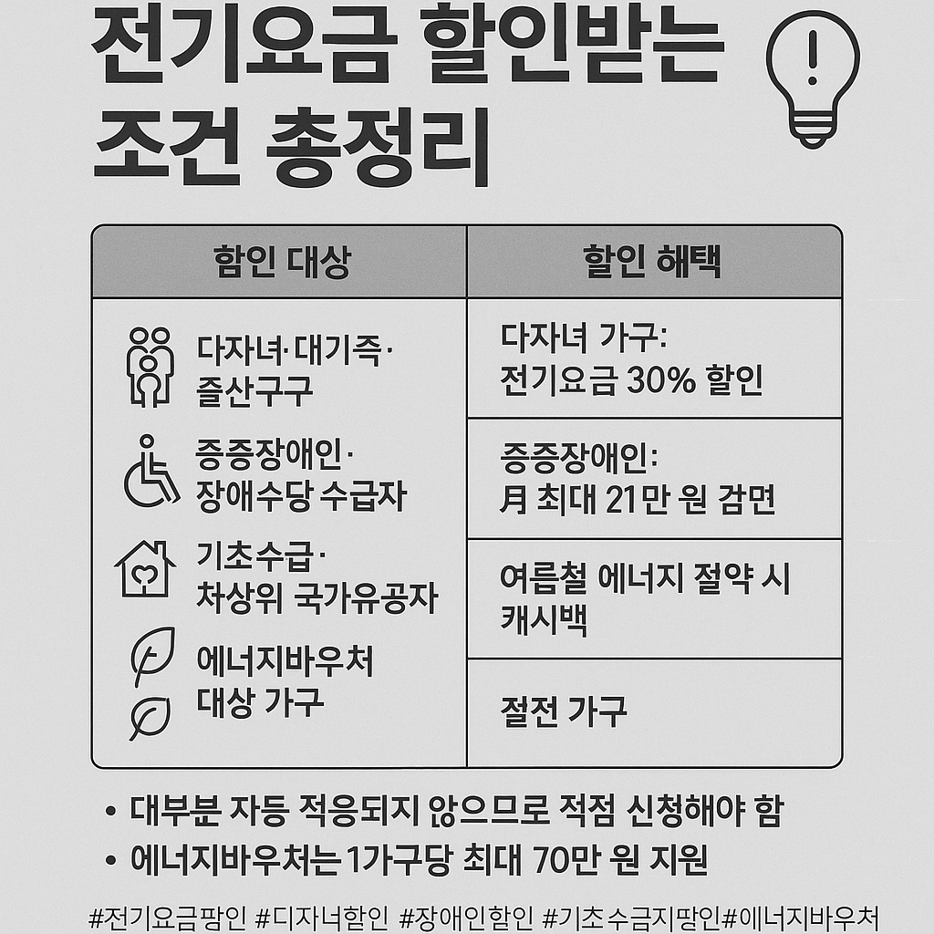 #전기요금할인 #다자녀할인 #장애인할인 #기초수급자할인 #에너지바우처 #전기요금감면 #여름전기세 #누진제완화 #전기세절약 #정부지원 #한전할인 #에너지캐시백 #절전보상 #복지할인 #출산가구혜택 #장애수당감면 #국가유공자혜택 #에너지정책 #저소득층지원 #전기세신청방법