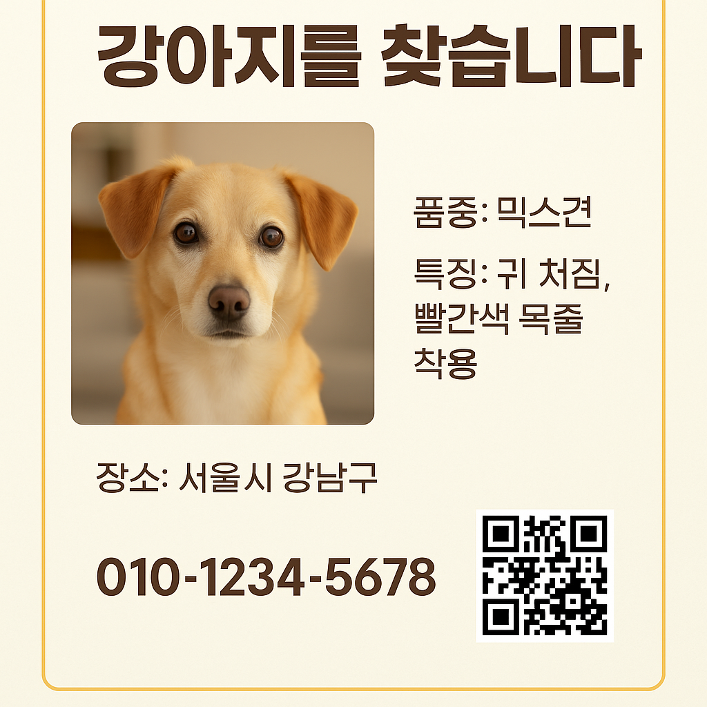 내용: 9/15(일) 오후 7:20, ○○아파트 307동 앞에서 겁을 먹고 뛰어 도망쳤습니다. 4.2kg, 회색 줄무늬, 목줄/인식표 없음. 사람을 경계하나 먹이에 반응. 보신 분은 위치·시간·이동방향을 문자 부탁드립니다. 발견 시 안전한 거리에서 사진 먼저 부탁드립니다. 연락처 010-XXXX-XXXX / 010-YYYY-YYYY (사례 있음)