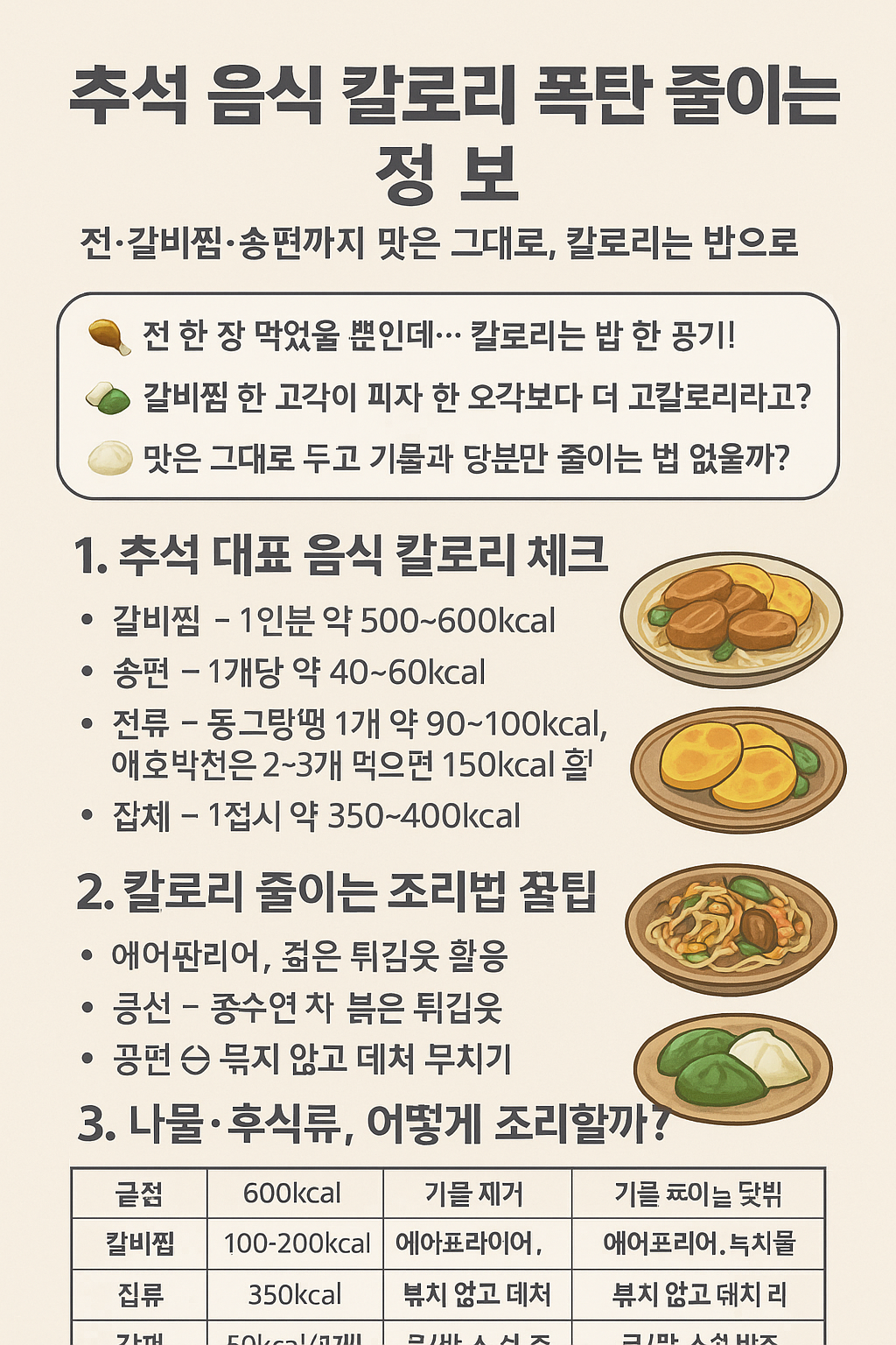 맛은 포기 못 하겠고, 칼로리는 줄이고 싶을 땐? 조리법을 바꿔야죠! 여기, 병원 영양사들도 추천하는 **명절 음식 칼로리 낮추는 비법** 모아봤어요 🧑🍳