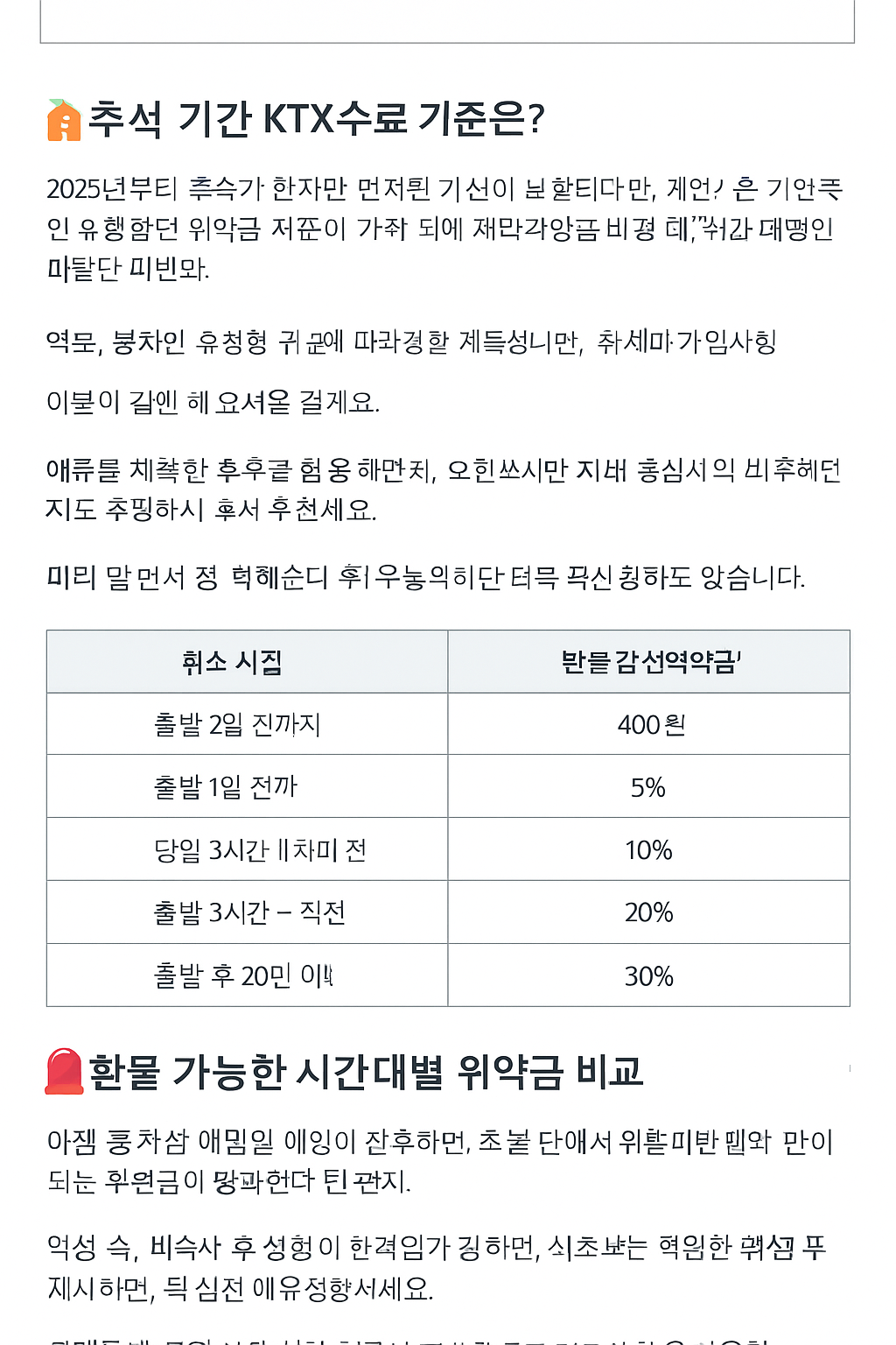 여러분! 오늘은 2025년 추석 KTX 예매 취소 및 환불 수수료에 대해 꼼꼼히 알아보았습니다. 명절 기간에는 평일과 다른 위약금이 적용되기 때문에, 미리 수수료 기준을 확인하고 현명한 예매·취소 전략을 세우는 것이 중요합니다.