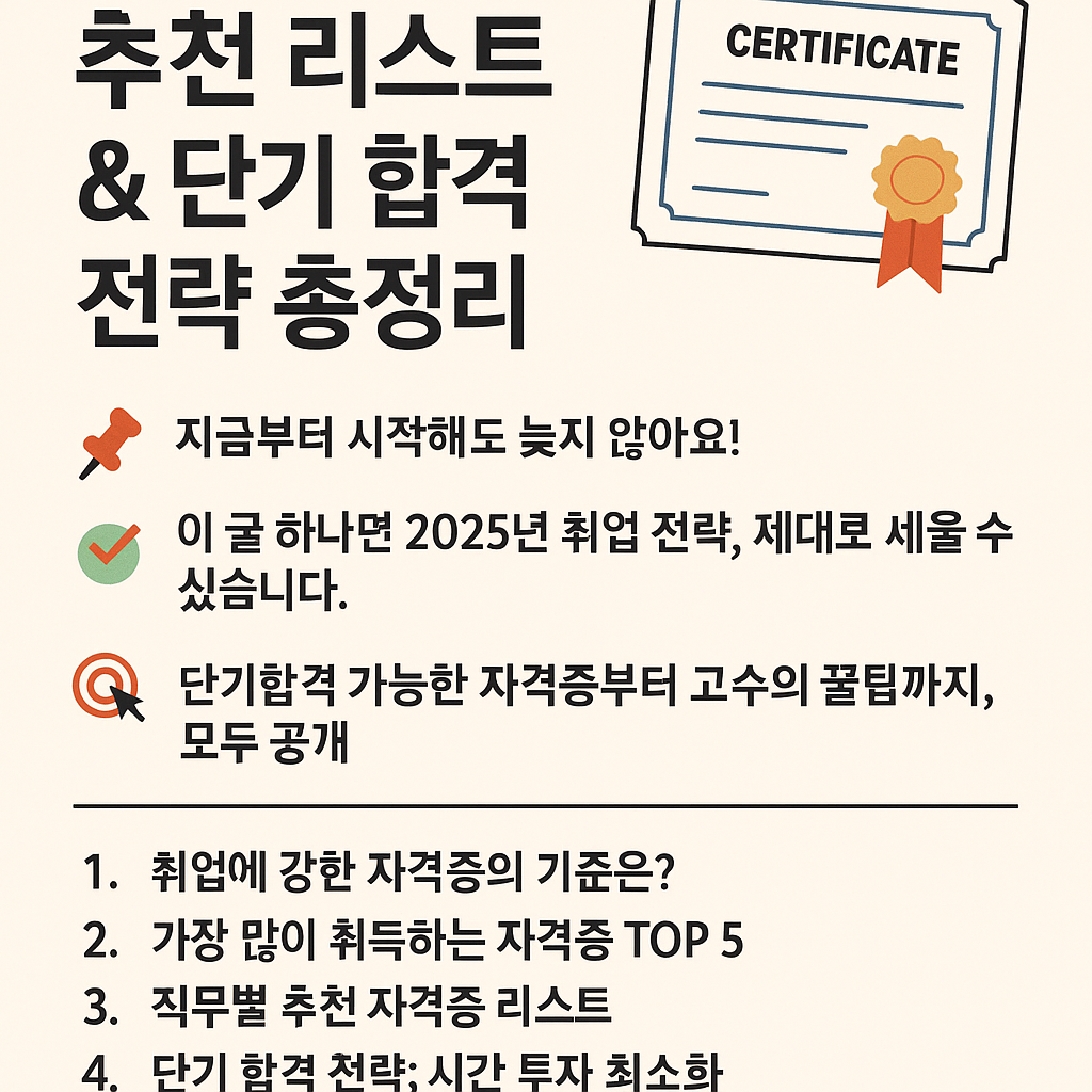 해시태그: #취업자격증 #자격증추천 #2025자격증 #단기합격 #공기업자격증 #국가자격증 #민간자격증 #IT자격증 #토익 #한국사 #정보처리기사 #컴활 #GTQ #직무별자격증 #스펙업 #자소서자격증 #취준생 #이직준비 #자격증전략 #취업스펙