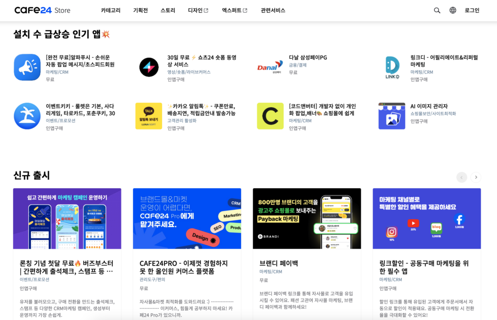 카페24가 Shopify(쇼피파이) 모델을 벤치마킹하면서 가장 중요해진 비용 항목입니다. 기본 기능 외에 고객 관리(CRM), 리뷰 관리, 마케팅 자동화, 재고 관리 등 고급 기능은 **'앱스토어'**에서 앱을 설치해 사용해야 합니다.