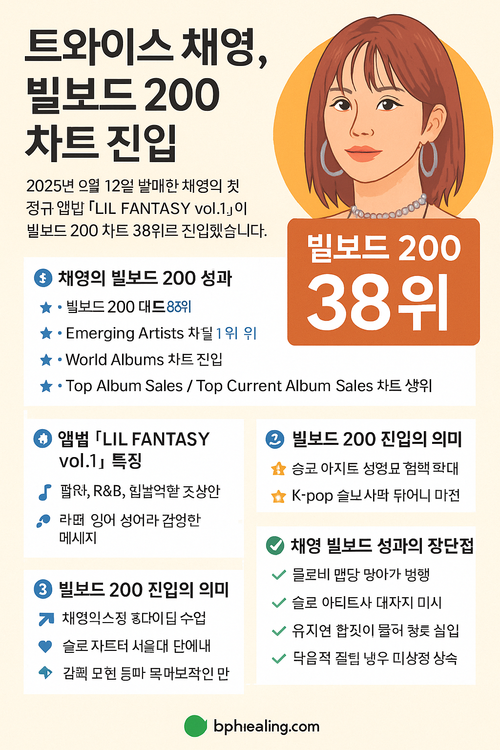 트와이스 멤버 채영은 2025년 9월 12일 발매한 솔로 데뷔 앨범 “LIL FANTASY vol.1”으로 미국 빌보드 200 차트에 **38위**로 데뷔했습니다. 이는 그녀의 첫 솔로 앨범이자, 솔로 아티스트로서 가장 높은 데뷔 기록입니다.