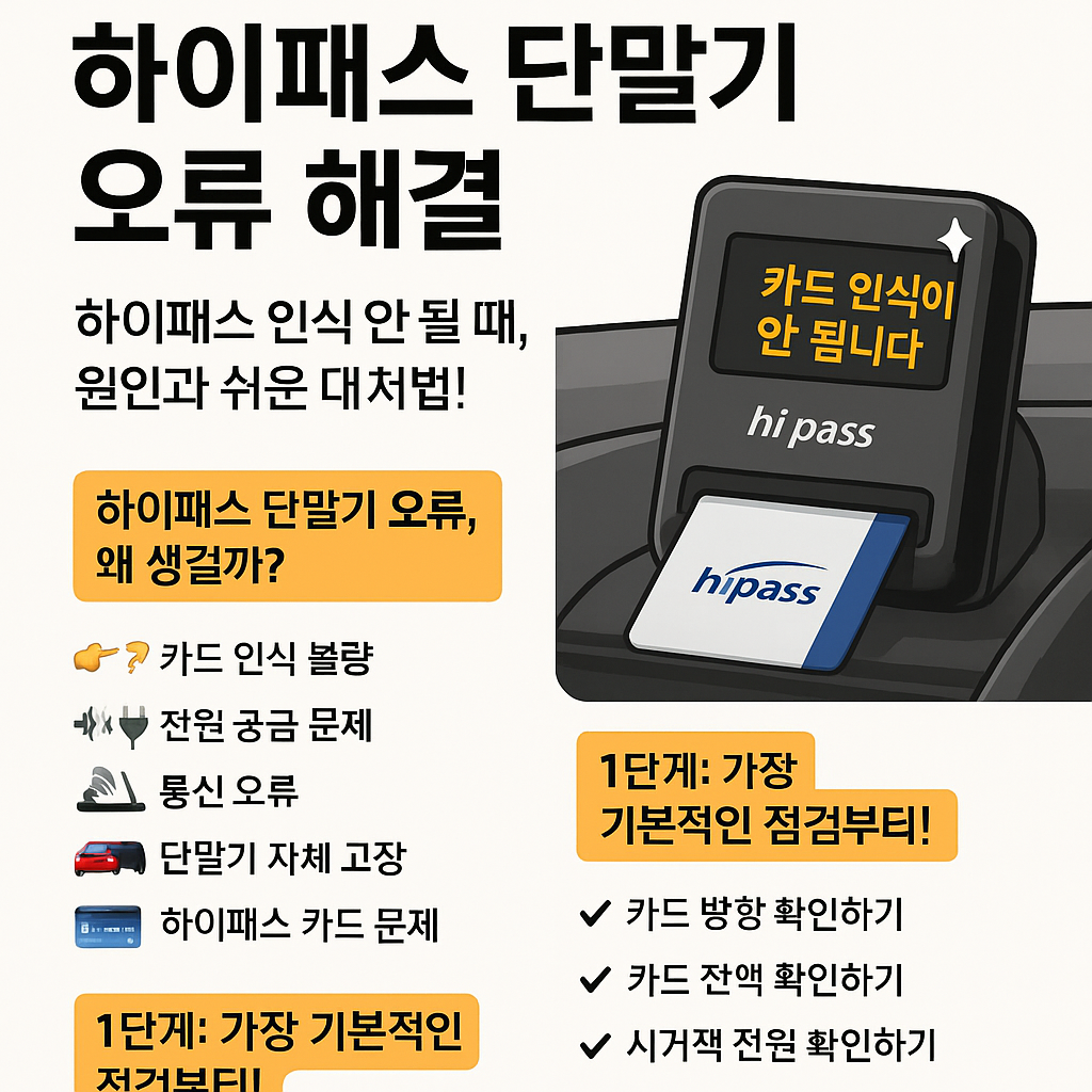 하이패스 단말기의 오류는 대부분 전원, 카드, 인식 위치, 또는 장치 고장으로 인해 발생합니다.