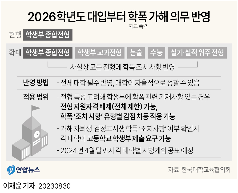 - 정시(수능) 전형의 치명타: 과거 서울 주요 대학을 포함한 많은 대학이 정시에서 '수능 100%'로 학생을 선발했습니다. 하지만 2026학년도부터는 수능 위주 전형에서도 학교생활기록부(생기부)의 학폭 기록을 의무적으로 반영해야 합니다. 대학들은 학폭 조치 사항에 따라 수능 총점에서 일정 점수를 '감점'하거나, 심각한 경우 '지원 자격 미달'로 불합격 처리할 수 있습니다.