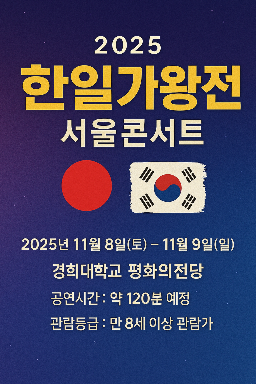 2025 한일가왕전은 한국과 일본의 대표 가수들이 함께하는 음악 교류 콘서트입니다. 특히 이번 서울 무대는 11월 8일(토)과 9일(일) 양일간 경희대학교 평화의전당에서 개최됩니다. 관람 연령은 8세 이상, 공연 시간은 약 120분으로 구성되어 있습니다. 트로트, 발라드, 댄스, 팝 등 다양한 장르의 무대를 즐길 수 있어 세대 구분 없이 즐기기 좋은 공연으로 꼽힙니다.