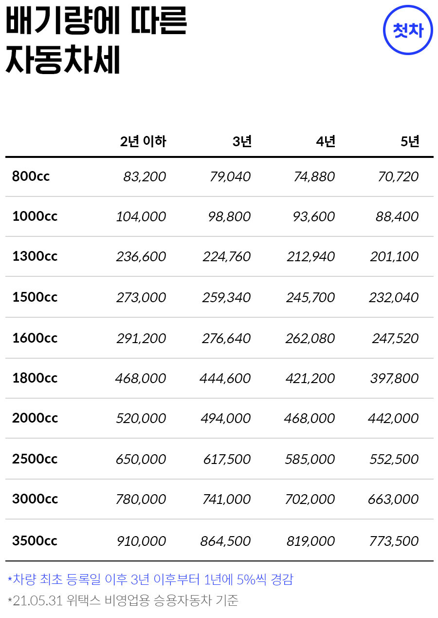 - 신차 기준: 1,999cc x 200원 = 399,800원