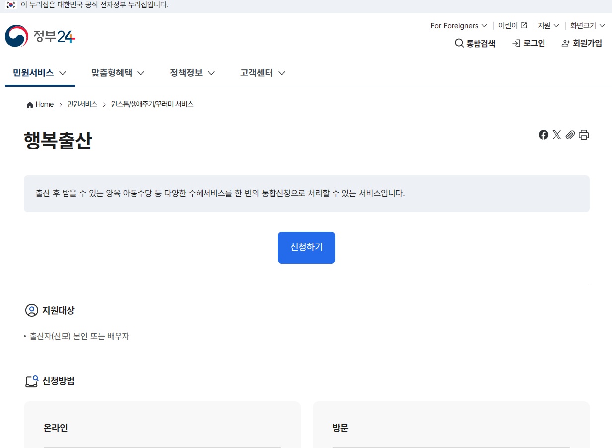 - 방법: 출생신고를 온라인(대법원 전자가족관계등록시스템)으로 마친 후, '정부24'에 접속하여 '행복출산 원스톱 서비스'를 신청합니다.