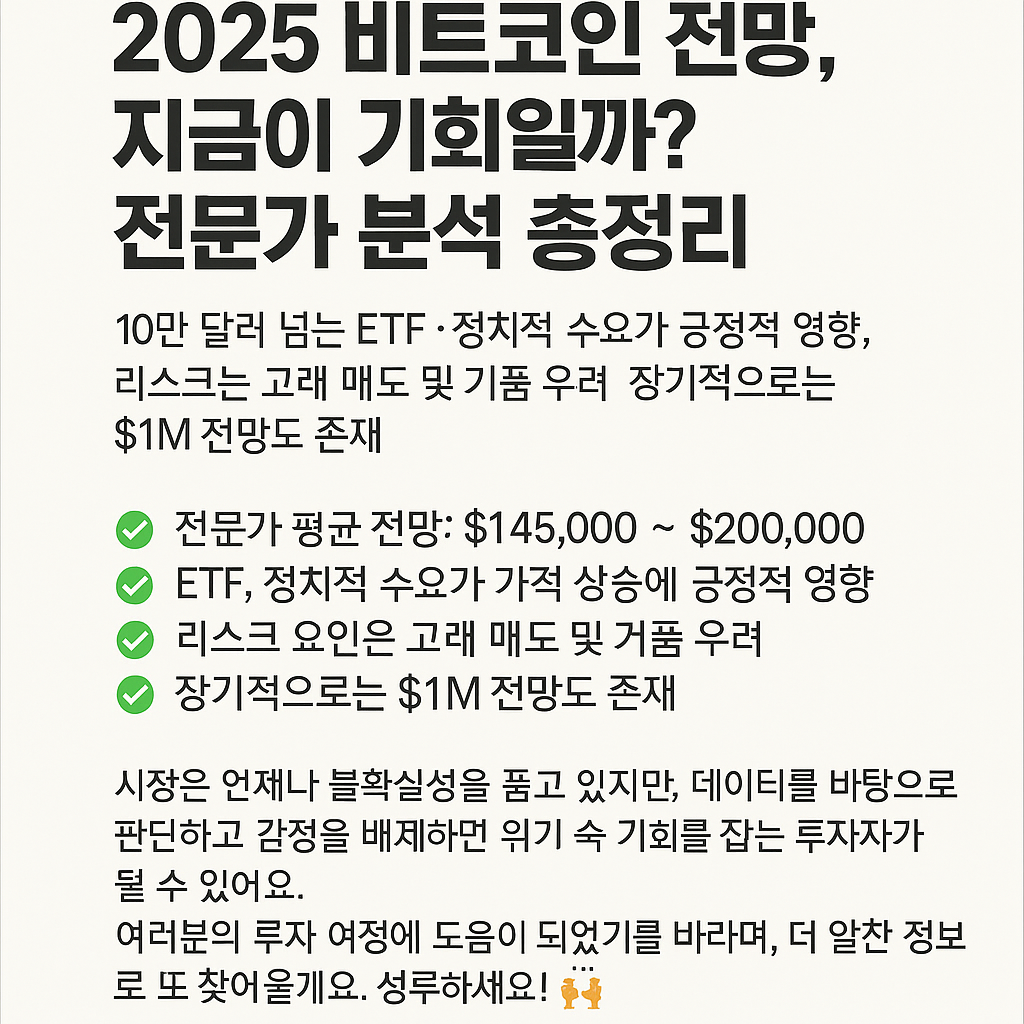 #비트코인전망 #비트코인2025 #비트코인가격예측 #비트코인ETF #암호화폐투자 #BTC분석 #디지털금 #가상화폐예측 #비트코인투자전략 #고래매도 #코인가격분석 #장기투자 #비트코인리스크 #ETF자금유입 #비트코인백만달러 #트럼프비트코인정책 #암호화폐전문가전망 #BTC예측 #비트코인호재 #비트코인단기전망