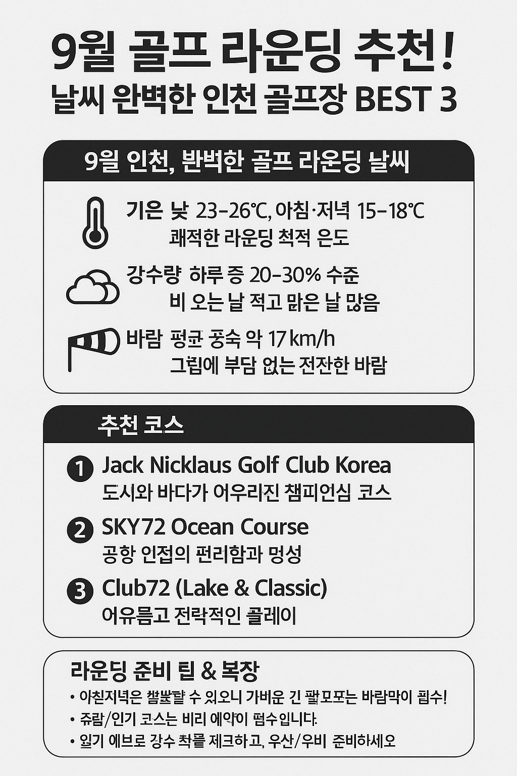 이번 포스팅에서는 9월 골프 라운딩에 적합한 인천 날씨 조건과 추천 골프장 TOP 3를 소개할게요.