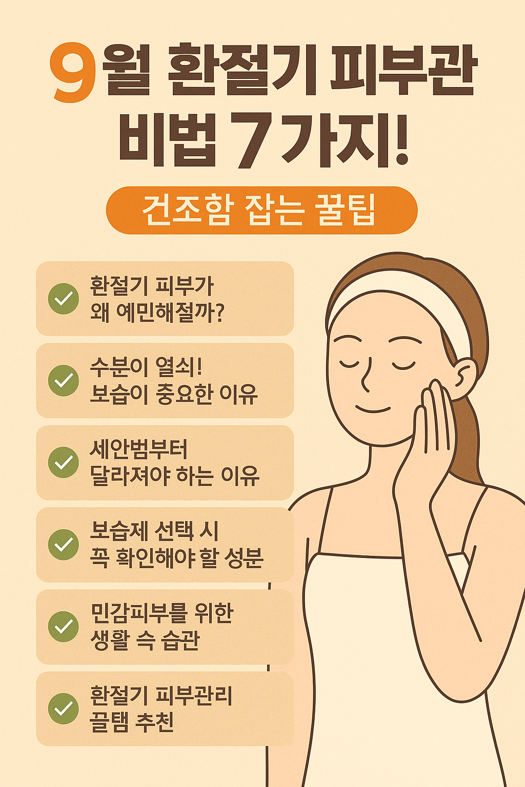 9월, 아침저녁으로는 선선하고 낮에는 따뜻한 날씨가 계속되면서 피부는 점점 건조해지고 민감해지기 쉬운 시기입니다. 환절기에는 급격한 기온 차와 습도 변화 때문에 피부 트러블이 심해지고, 특히 수분 부족으로 인한 각질이나 당김 현상이 자주 발생하죠. 그래서 오늘은 **9월 환절기 피부관리 비법 7가지**를 알려드릴게요. 누구나 쉽게 따라할 수 있고, 효과도 좋은 꿀팁들이니 끝까지 읽어주세요!