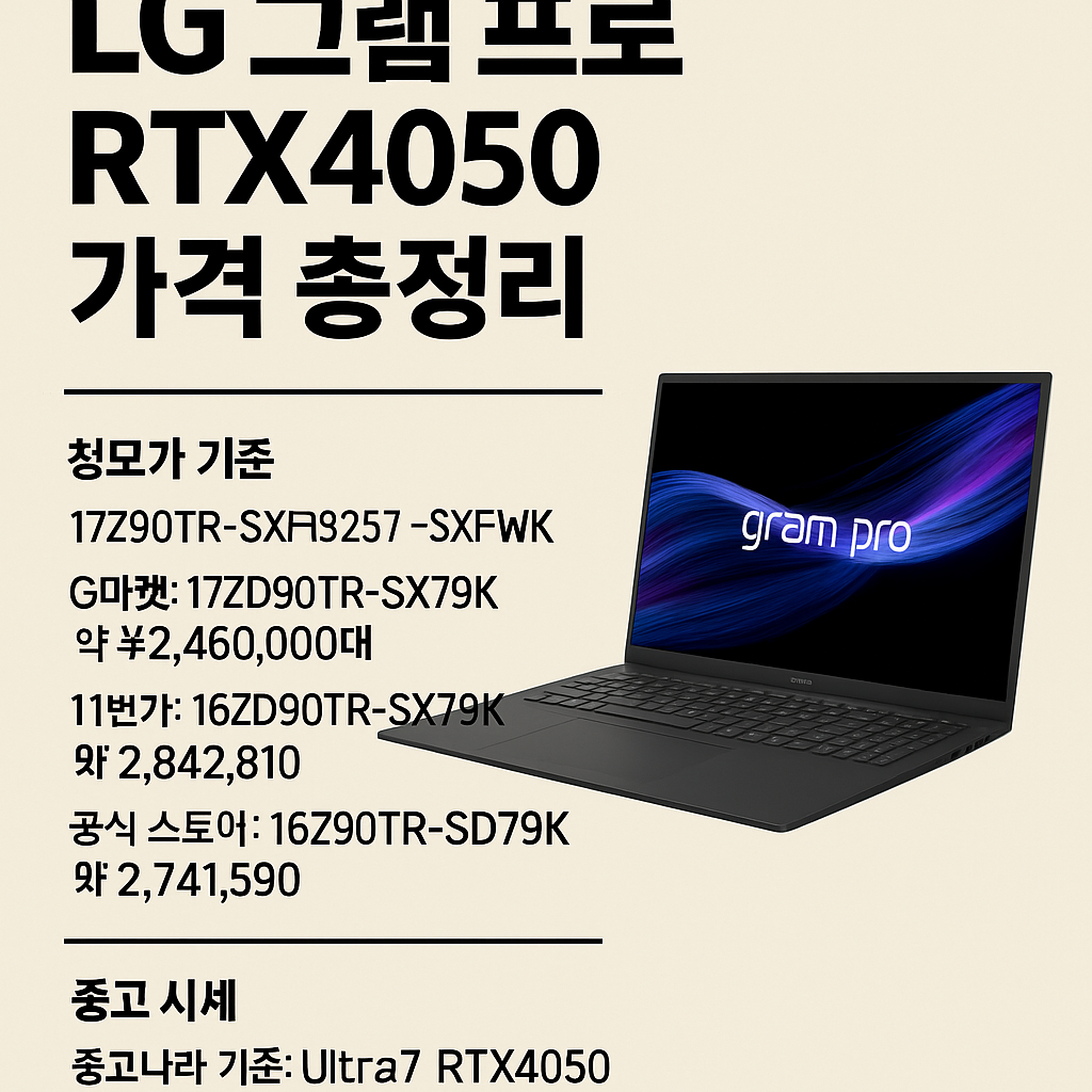 LG 그램 프로 RTX4050 가격은 사양과 옵션에 따라 차이가 있습니다. - 16인치 Ultra5 / 32GB / 512GB SSD: 약 2,750,000원 - 17인치 Ultra7 / 32GB / 512GB SSD: 약 2,350,000원 - 16인치 Ultra7 / 32GB / 1TB SSD: 약 3,000,000원 공식 온라인몰, 오픈마켓, 학생인증몰 등에서 다양한 혜택이 제공되니 구매 시 프로모션 여부를 꼭 확인하는 것이 좋습니다.